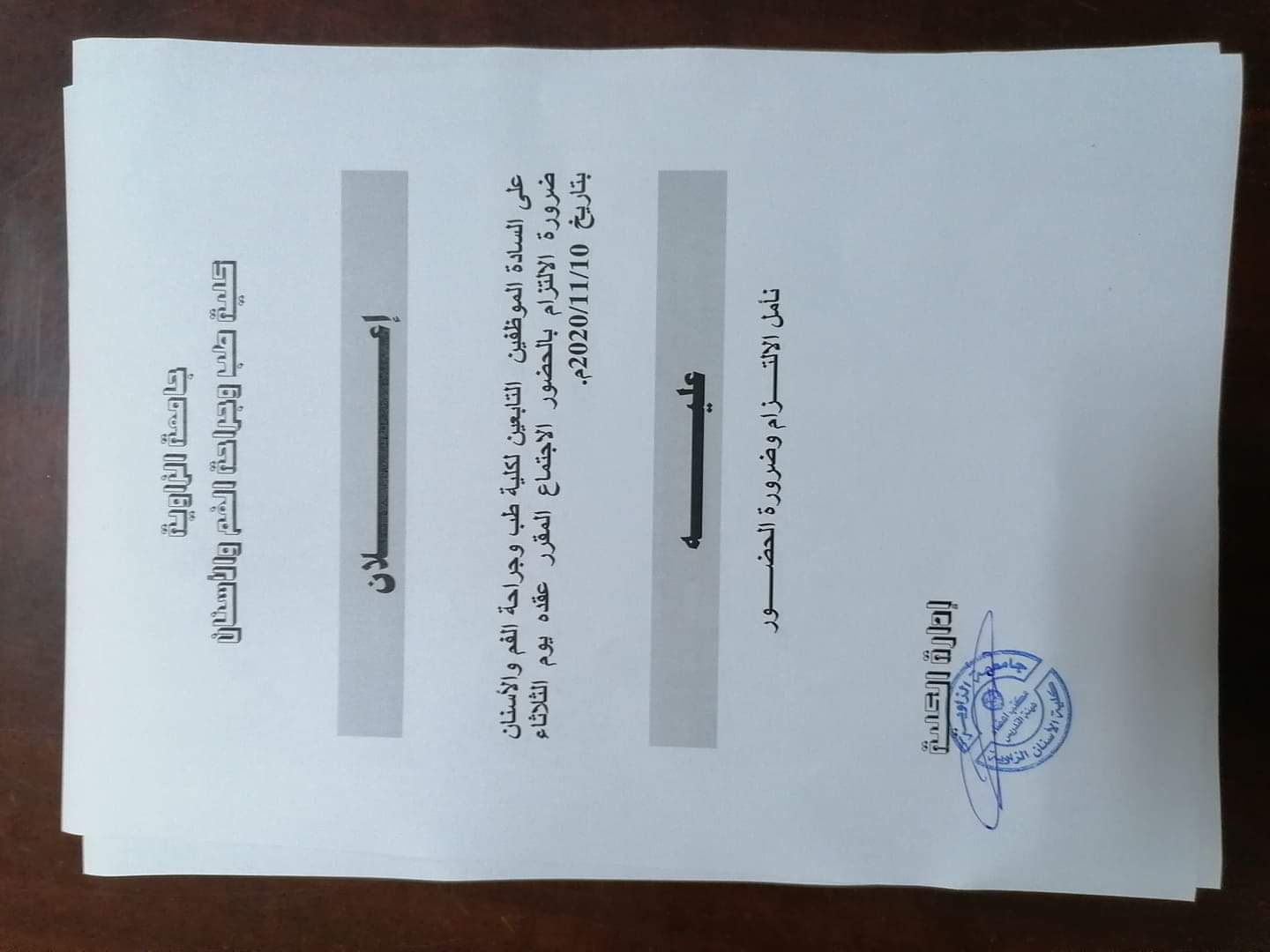 علي السادة الموظفين التابعين لكلية طب وجراحة الفم والأسنان بالزاوية ضرورة الإلتزام بالحضور الاجتماع المقرر عقدة يوم الثلاثاء بتاريخ 10_11_2020  وللأهمية الرجاء التقيد بالحضور مع مراعاة الاتباع بالإجراءات الوقائية.
