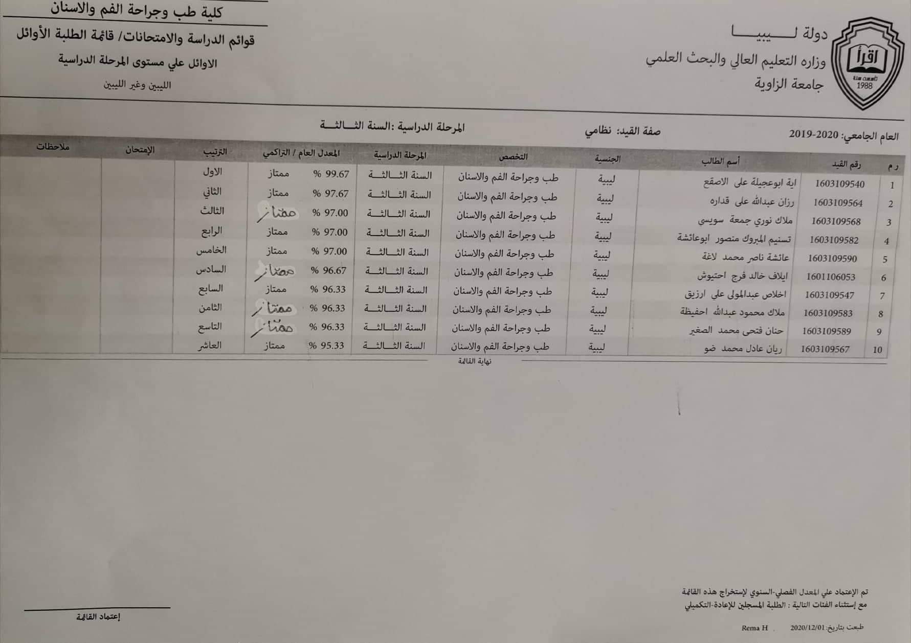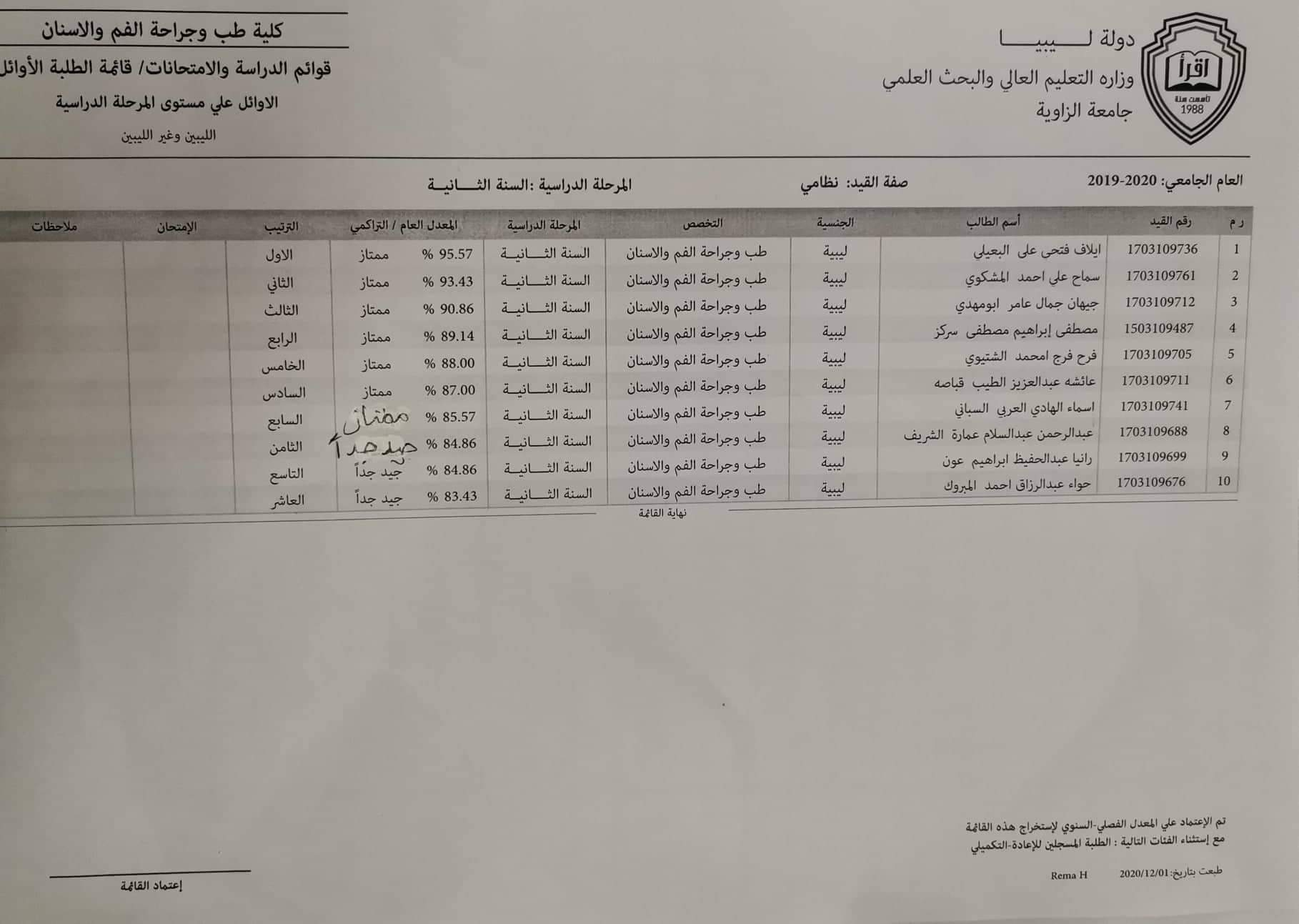نتيجة الطلبة الأوائل السنة الثانية والثالثة الدور الأول للعام الجامعي 2019 _2020