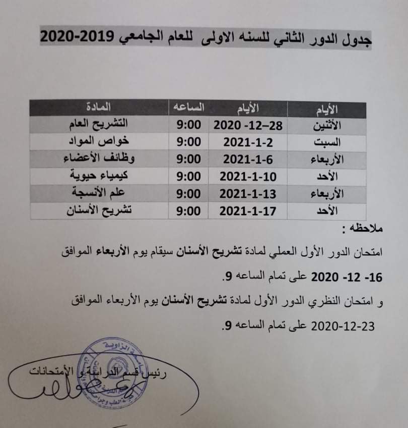 جدول امتحانات الدور الثاني للسنه الأولى والاعداديات الطبية للعام الجامعي 2019 - 2020