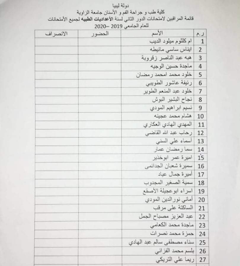 قائمة المعيدين المراقبين لامتحان الاعداديات الطبيه ليوم غذا السبت الموافق 9/ 1 /2021 على تمام الساعه 9 يرجى الإلتزام بالحضور