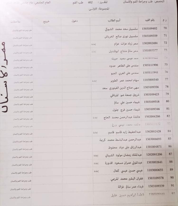 قوائم طلبه السنه الرابعه الدفعه 15 والتكميلي لامتحان مادة طب الفم ليوم الأحد القادم الموافق 13 / 6 / 2021 على تمام الساعة9:00 يرجى الإلتزام بالإجراءات الوقائية ويمنع دخول اي طالب دون ارتداء الكمامه وإحضار بطاقة التعريف ،،بالتوفيق للجميع