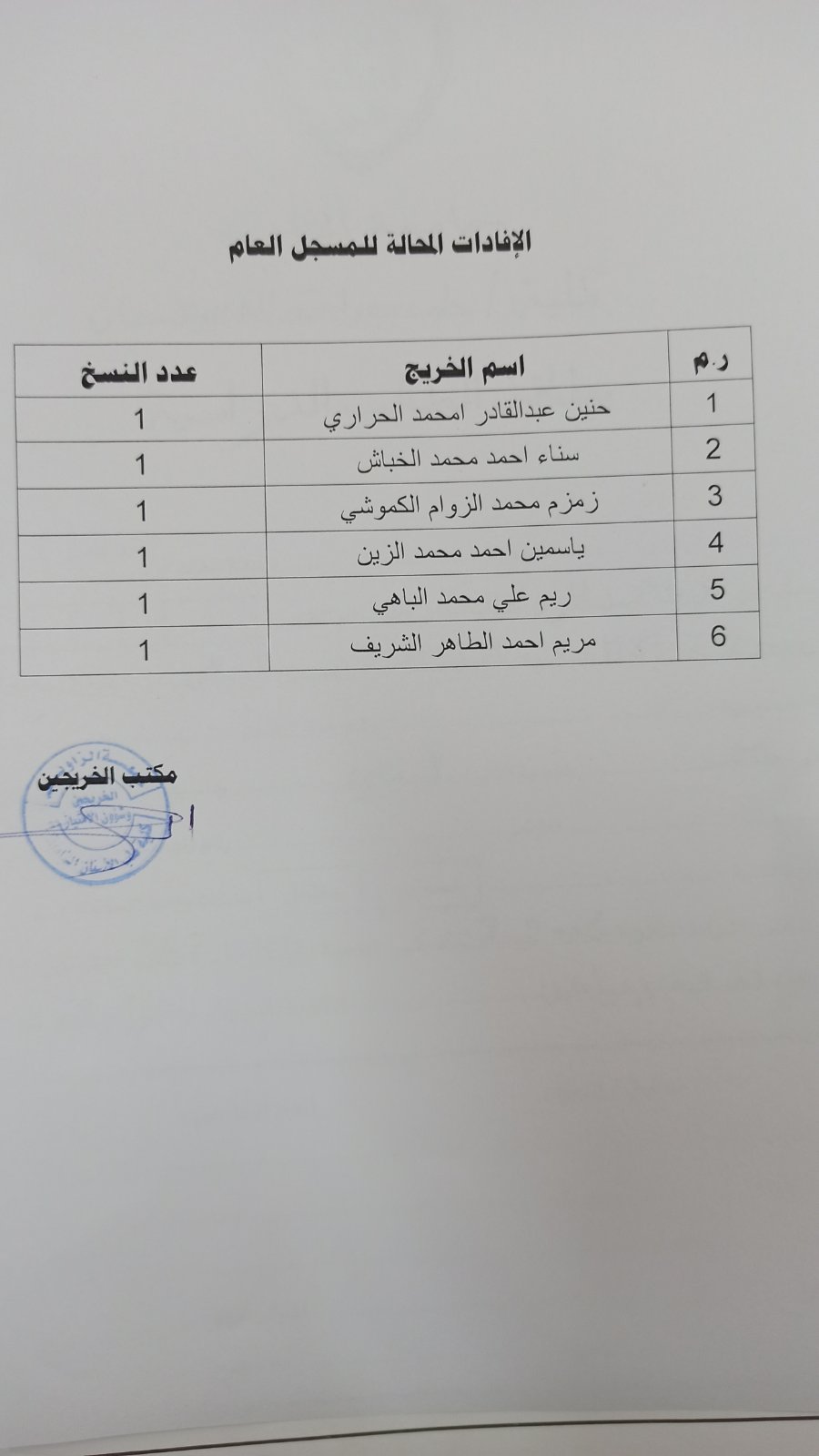 إعلان.. علي الطلبة الخريجين المذكوره أسمائهم في القوائم مراجعة مكتب المسجل العام بالجامعة وذلك لدفع الرسوم وإستلام إفادةالتخرج ..