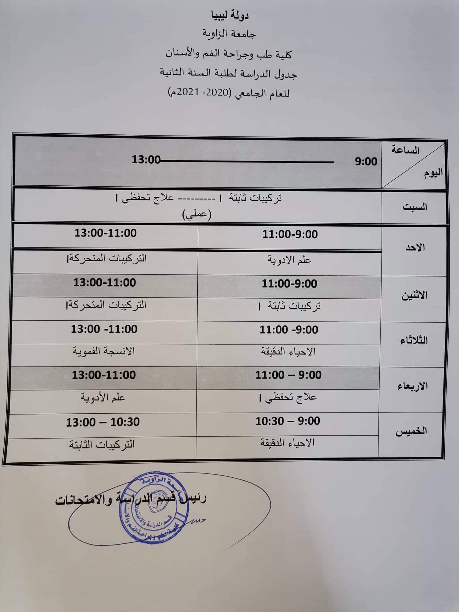 جدول الدراسة لطلبة السنة الثانية لعام 2020_2021 م