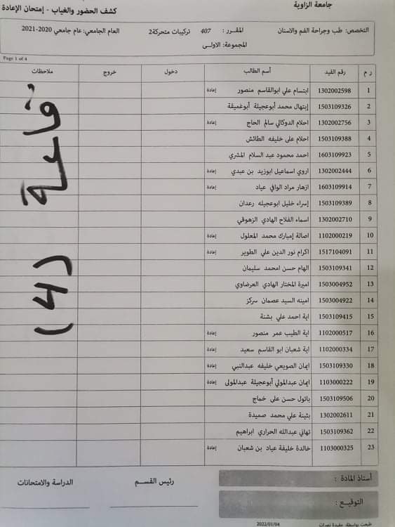 قوائم توزيع القاعات للامتحان الدور الثاني الدفعه 15 والتكميلي ليوم لمادة التركيبات المتحركة ليوم الأحد القادم الموافق 9 / 1 /2022 يرجى الإلتزام بالإجراءات الوقائية ولبس الكمامه وإحضار بطاقة التعريف