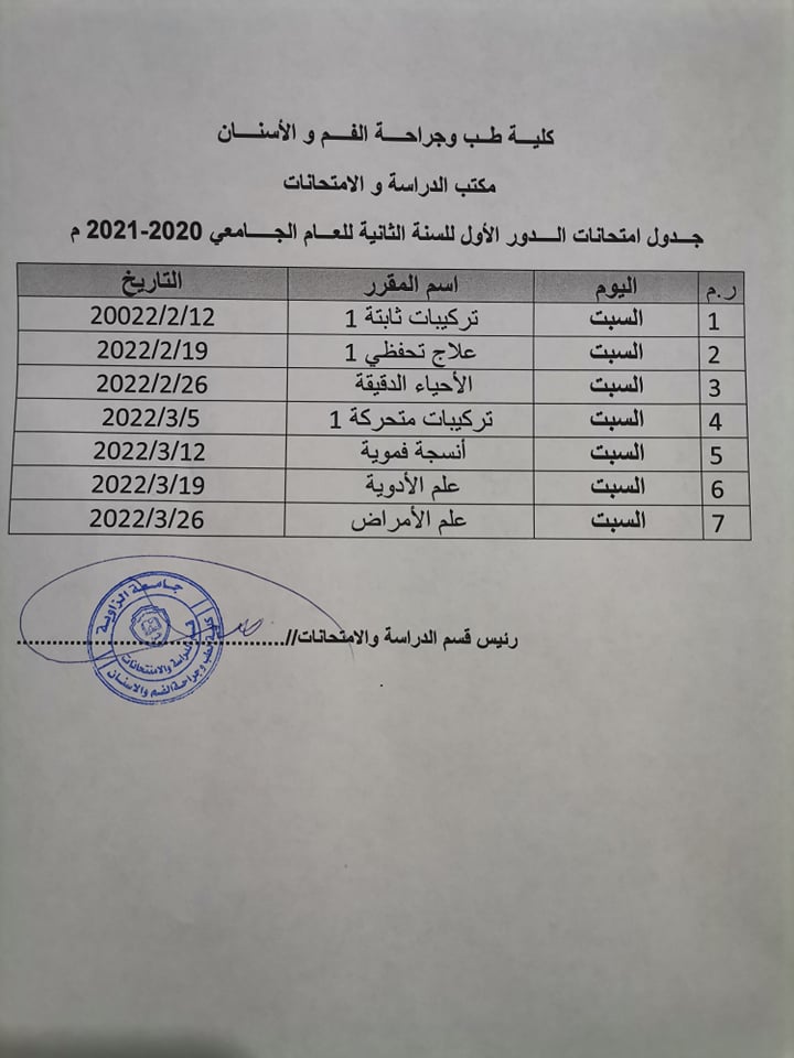 جدول امتحانات الدور الأول السنة الأولى والثانية للعام الجامعي 2020 /2021 م على تمام الساعه 9 يرجى الإلتزام بالإجراءات الوقائية ولبس الكمامه وإحضار بطاقة التعريف ،ويمنع اصطحاب الهاتف