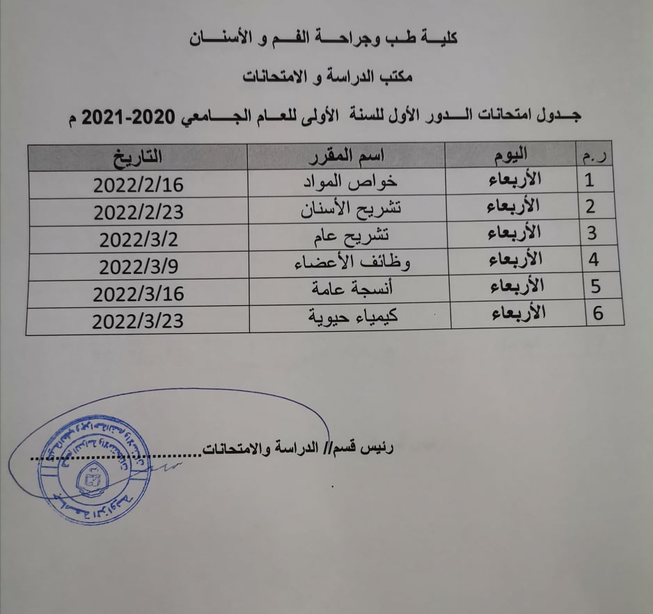 قائمة المعيدين المراقبين على امتحان الدور الأول السنة الأولى للعام الجامعي 2020 /2021 ابتدأ من يوم الأربعاء القادم الموافق 16/ 2 / 2022 على تمام الساعه 9 ،،يرجى الإلتزام بالحضور للأهمية