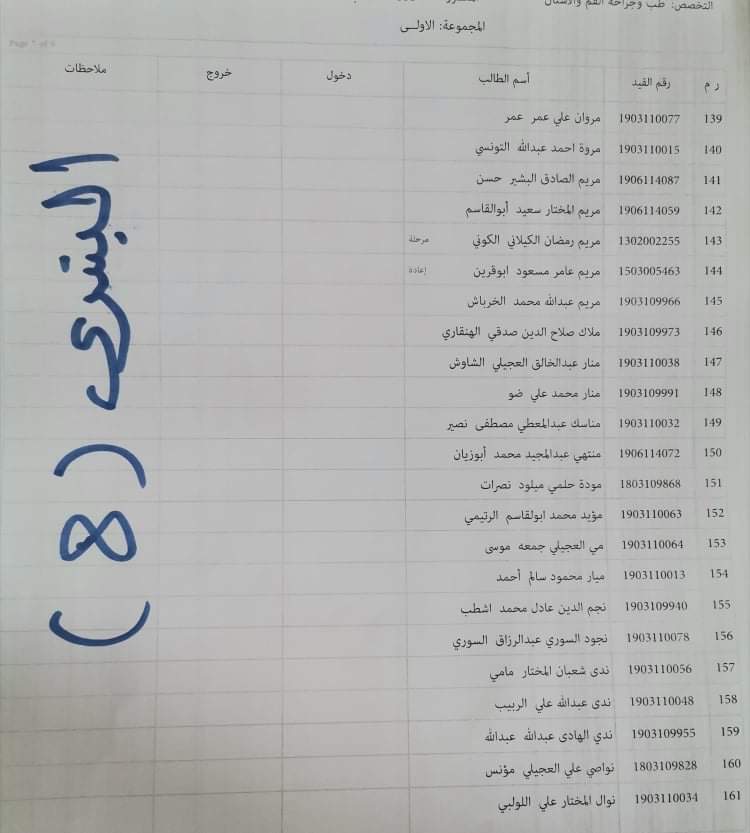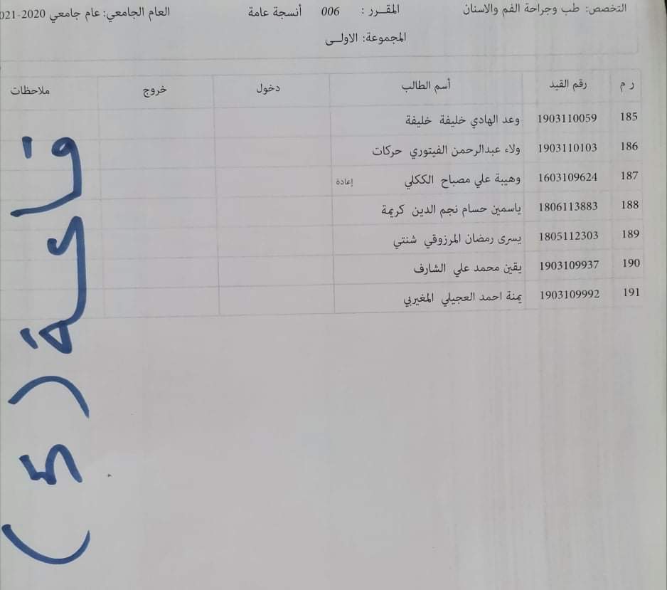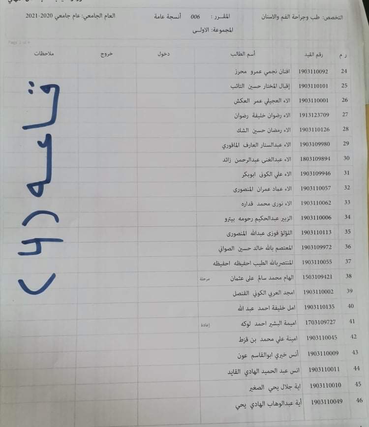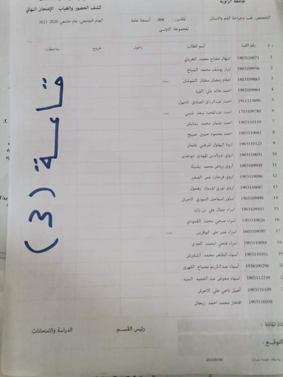 توزيع القاعات للامتحان الدور الأول السنة الأولى للعام الجامعي 2020_2021 لمادة الأنسجة العامة ليوم الأربعاء القادم الموافق 16 / 3 /2022 م على تمام الساعه 9 يرجى الإلتزام بالحضور قبل الموعد بنصف ساعة