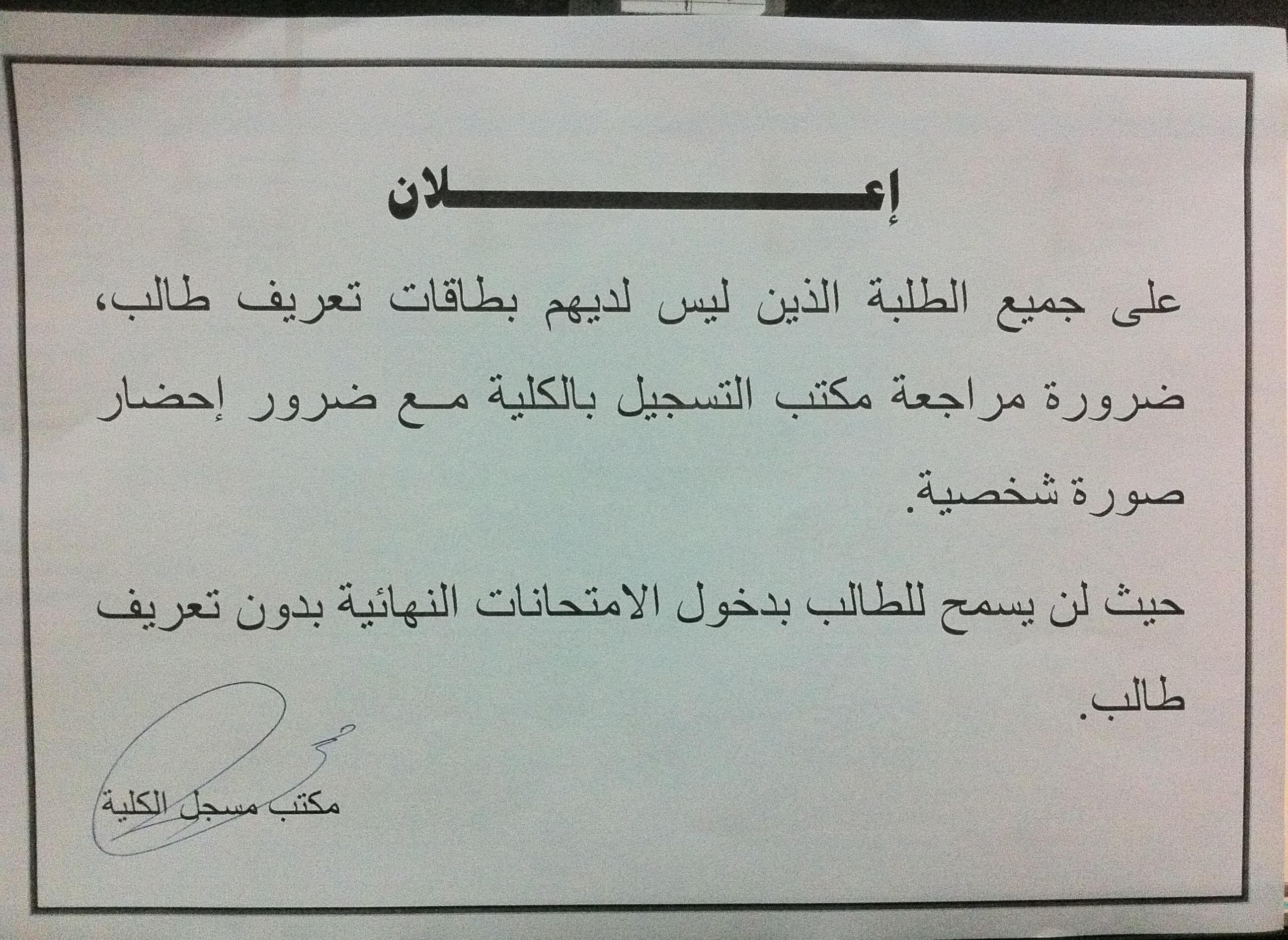 إلى كل الطلبة الذين ليس لديهم بطاقات تعريف طالب سرعة التواصل مع مكتب التسجيل بالكلية مصحوبين بصورة شخصية.