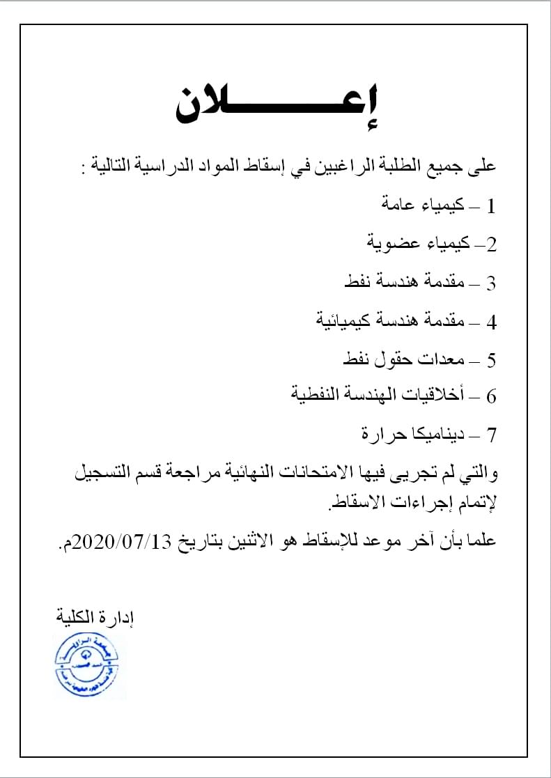 لكل الطلبة المسجلين بالمواد الدراسية والتي لت تجرى فيها الامتحانات النهائية للفصل الدراسي خريف 2019-2020م بسبب جائحة كورونا. بأنه يمكنهم ذلك واخر يوم للاسقاط هو الاثنين القادم بتاريخ 13-07-2020م. والمواد موجودة بصورة الاعلان