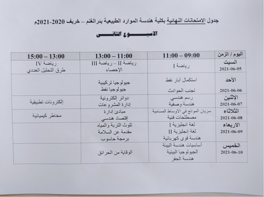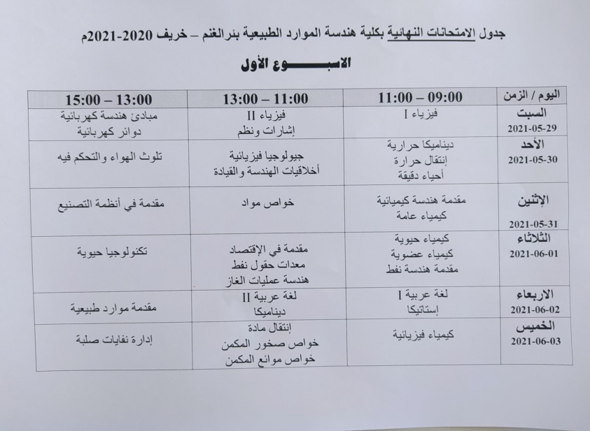 جدول الامتحانات النهائية للفصل الدراسي خريف 2020- 2021م