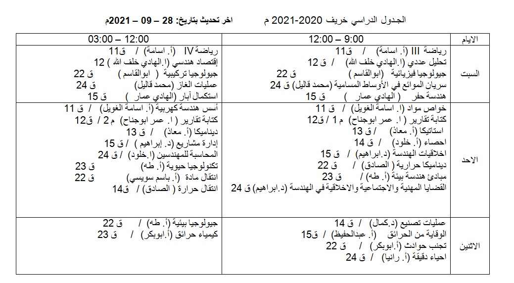 إلى جميع الطلبة تعلمكم إدارة الكلية بأن الدراسة لفصل الخريف 2021-2022م ستستأنف يوم السبت الموافق 20-11-2021م. وحسب الجدول المرفق والمعد مسبقا قبل إيقاف الدراسة.
