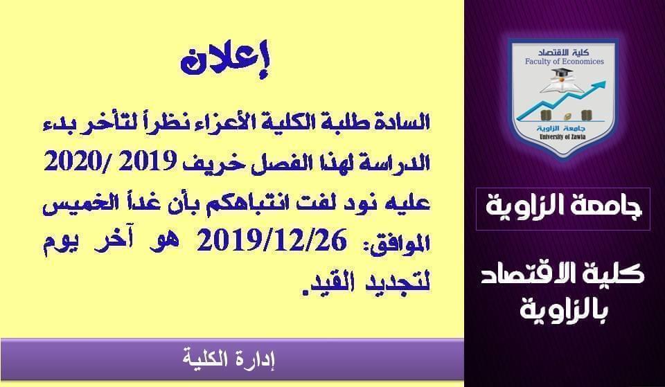 كلية الاقتصاد بالزاوية إحدى كليات جامعة الزاوية التي أنشئت في العام 2001 م بمقرها الأول الكائن بمنطقة الحرشة قبل أن تنتقل في عام 2011 م إلى مقرها الجديد بالمركب الجامعي لجامعة الزاوية، وتستهدف الكلية تأهيل الكفاءات العلمية المتخصصة وتخريج الكوادر البشرية لخدمة المجتمع في كافة مجالات العلوم الاقتصادية والمالية والإدارية في مرحلتي الدراسات الجامعية والدراسات العليا، وتهتم بالدراسات والبحوث العلمية النظرية والتطبيقية وتشجعها للمساهمة في حل المشكلات الاقتصادية المحلية للدفع بعجلة التقدم والنمو الاقتصادي وتحقيق الرفاهية الاجتماعية.