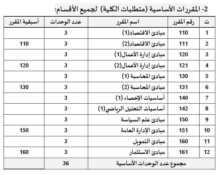 - المقررات الأساسية (متطلبات الكلية) لجميع الأقسام - المقررات الأساسية (متطلبات الكلية)  لجميع الأقسام