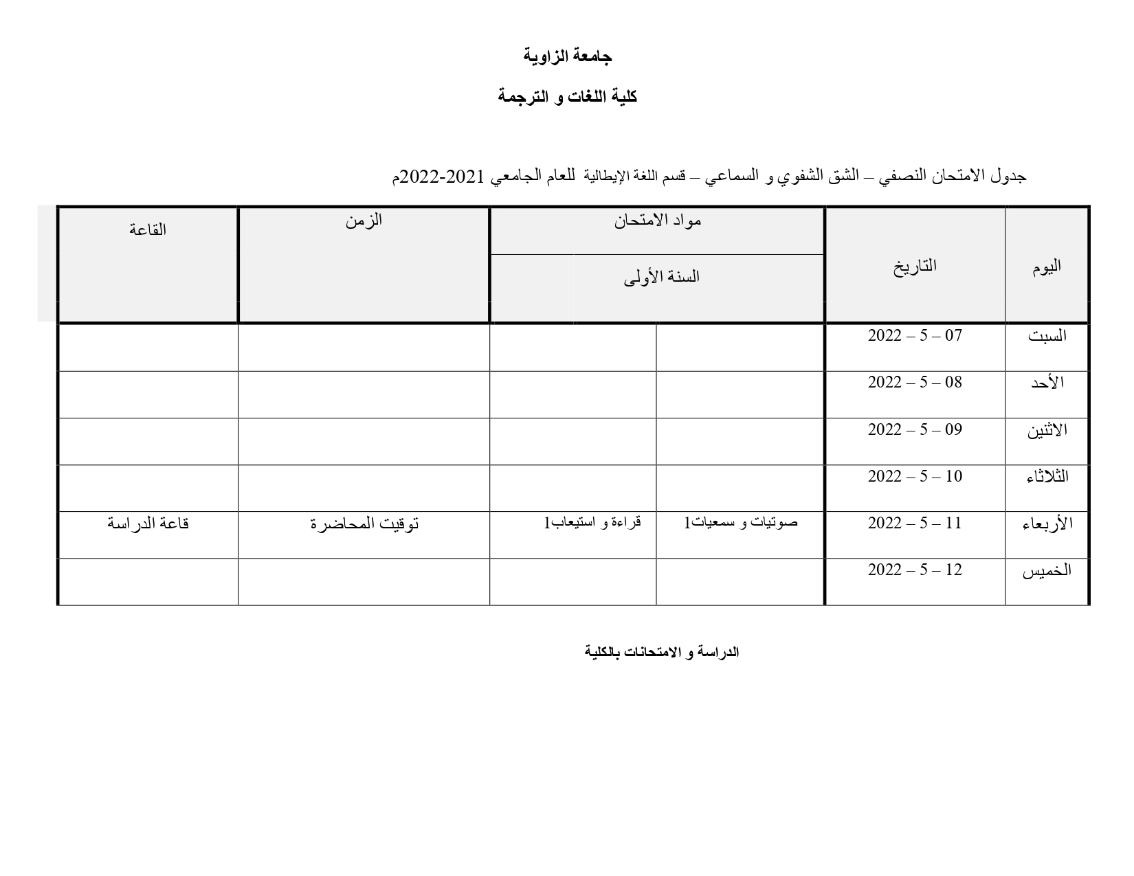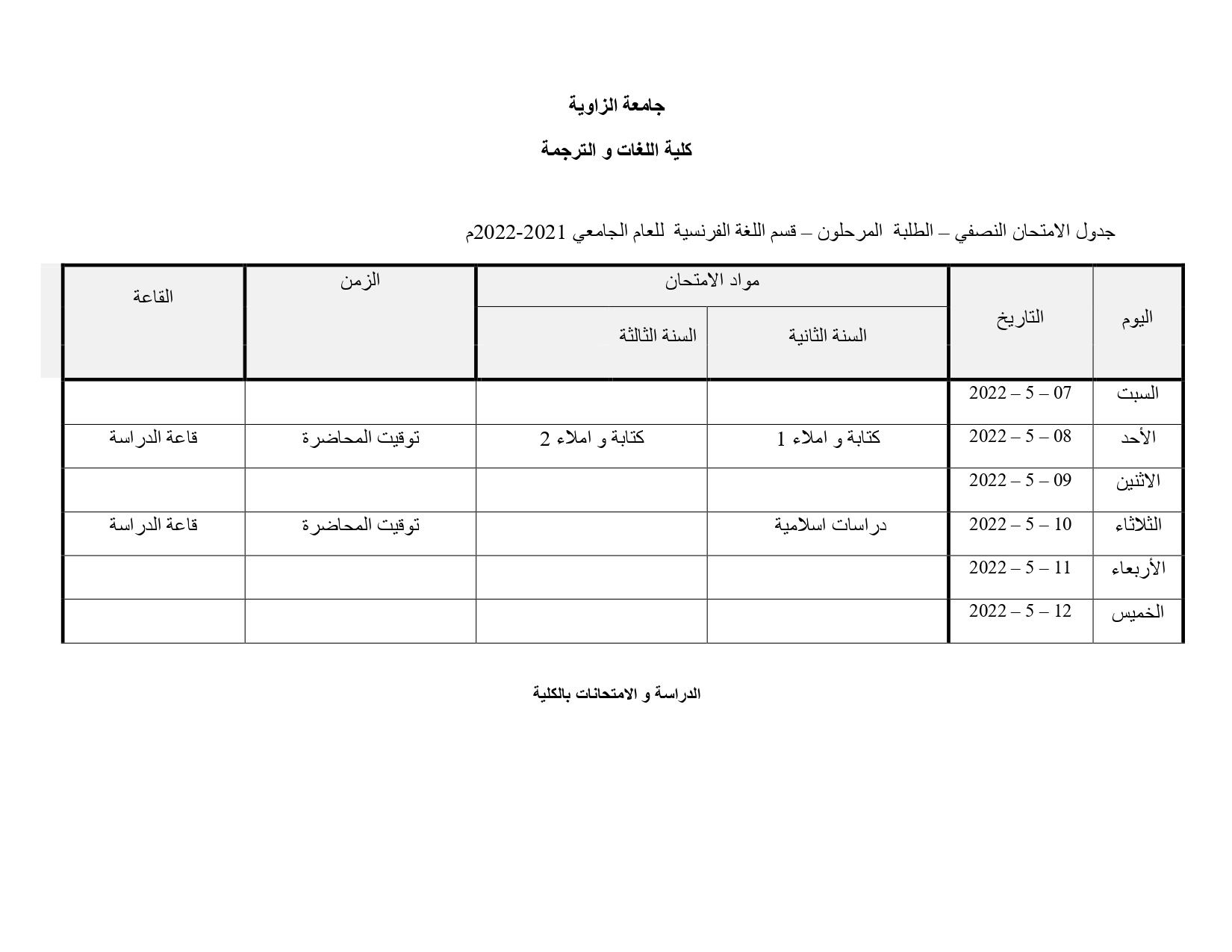 جداول الامتحانات النصفية والترحيل لكلية اللغات والترجمة