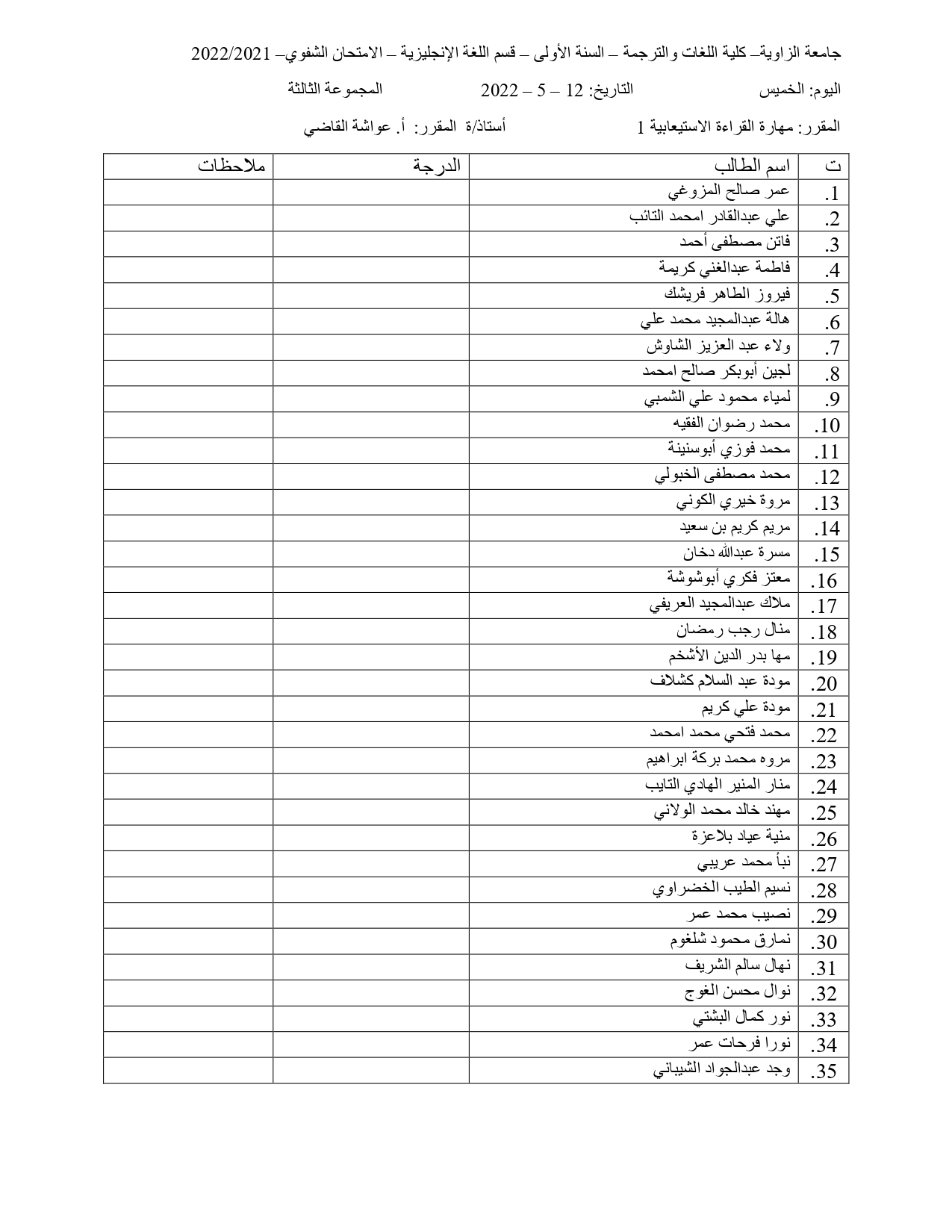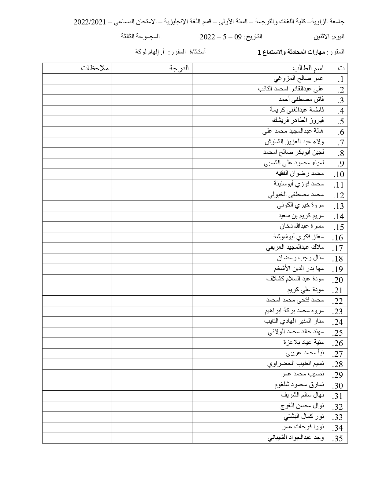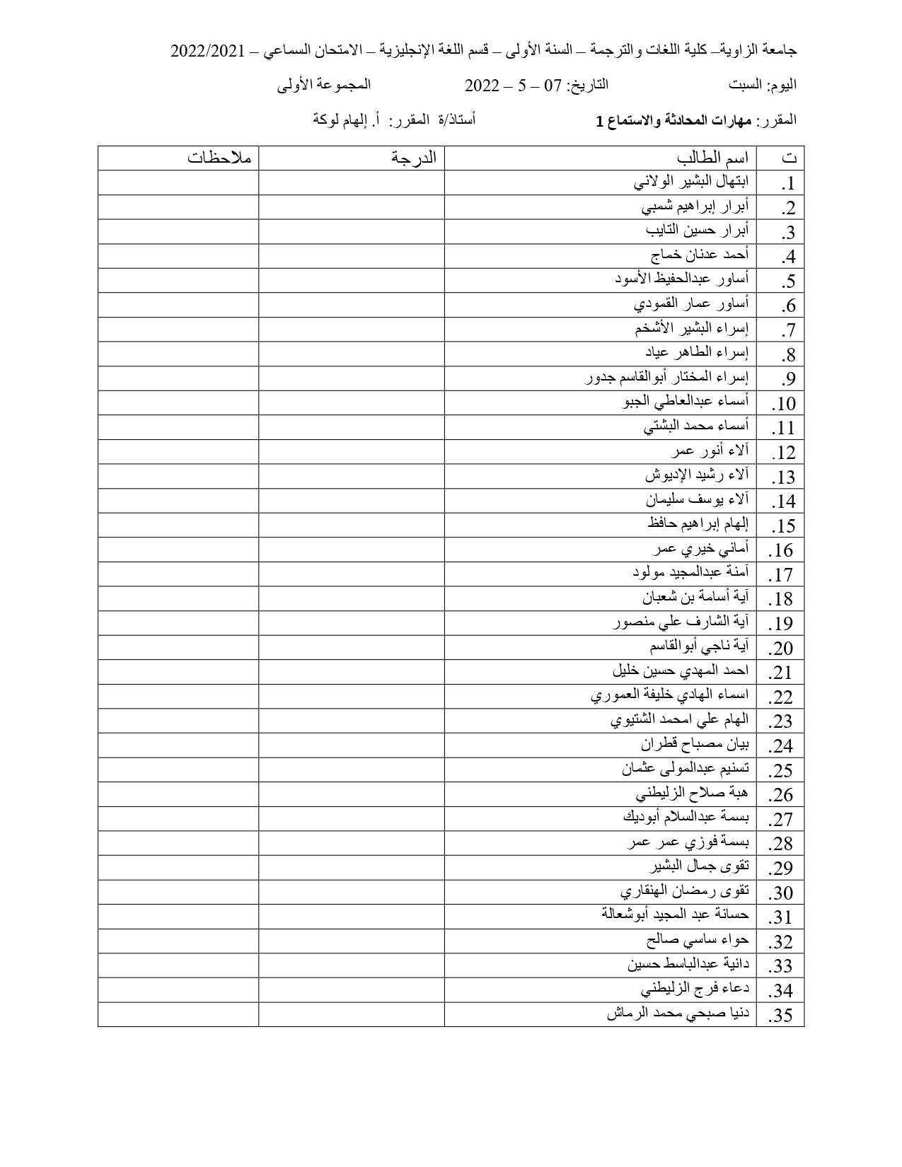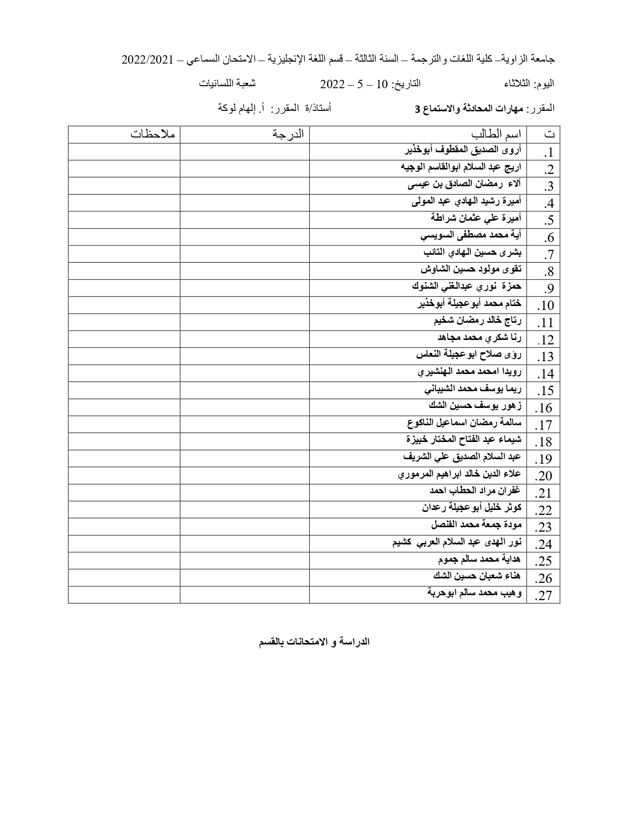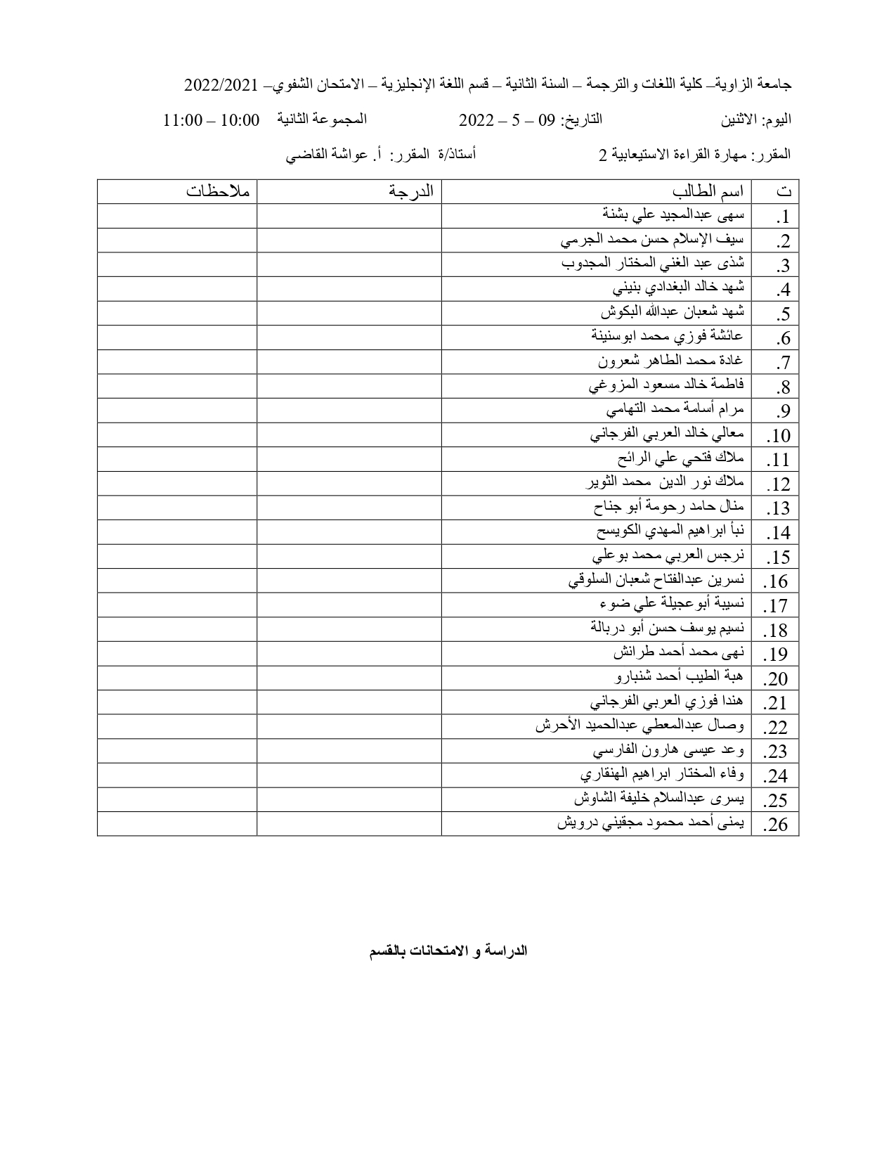 توزيع الطلبة في الامتحان الشفوي و السماعي