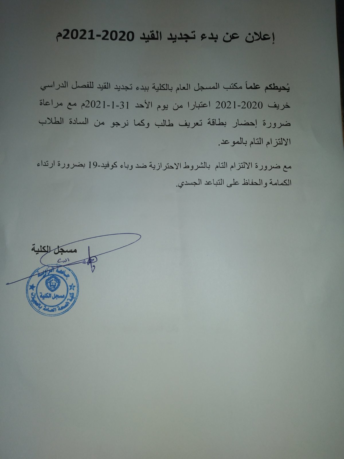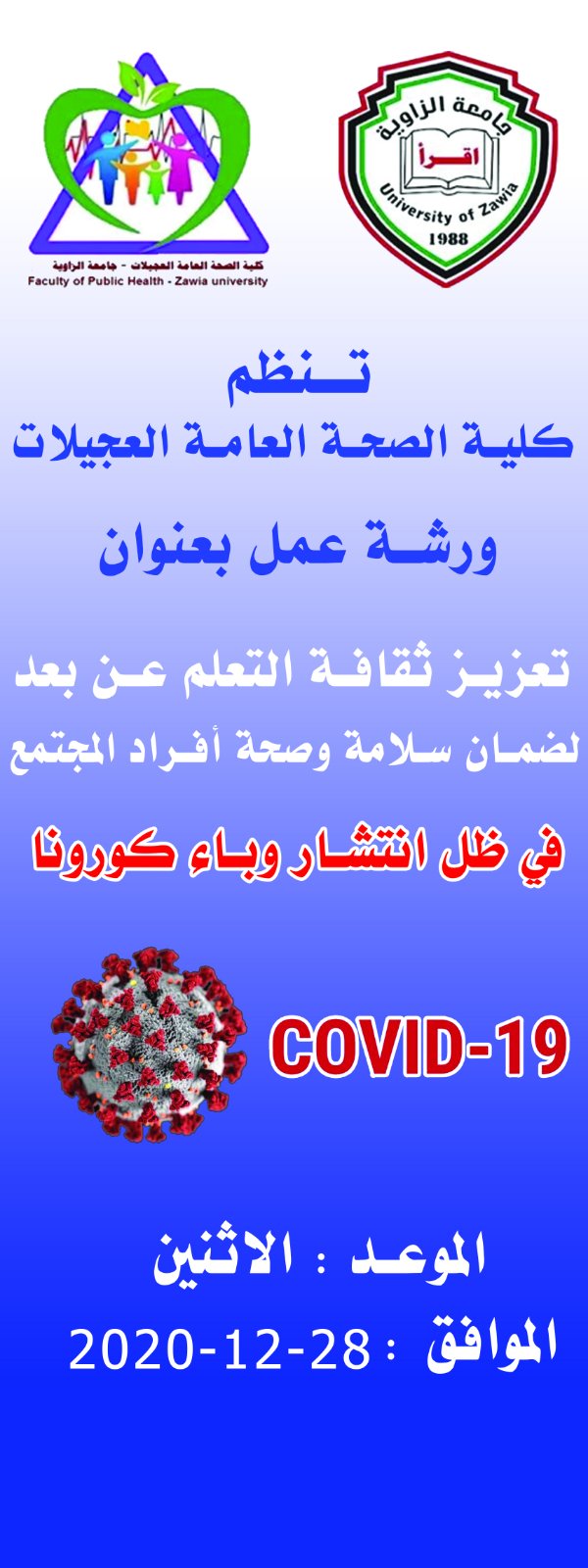 تعلن كلية الصحة العامة العجيلات عن اقامة ورشة عمل بعنوان تعزيز ثقافة التعليم عن بعد لضمان صحة وسلامة افراد المجتمع في ظل انتشار وباء كوفيد -19. وذلك يوم الأثنين 28-12-2020م.