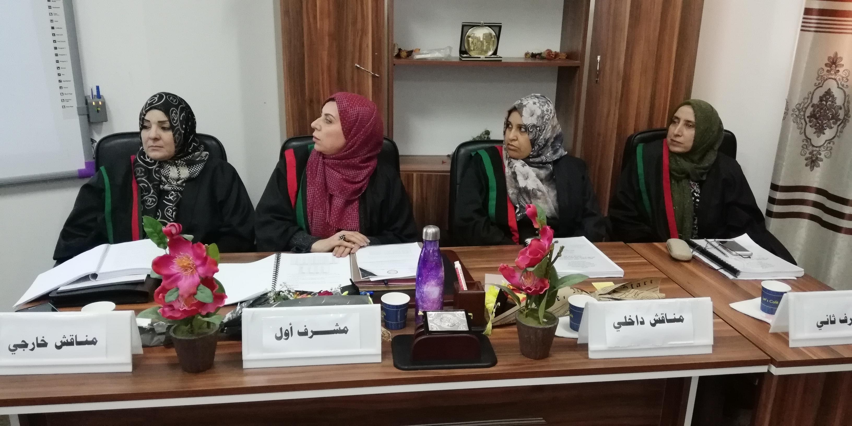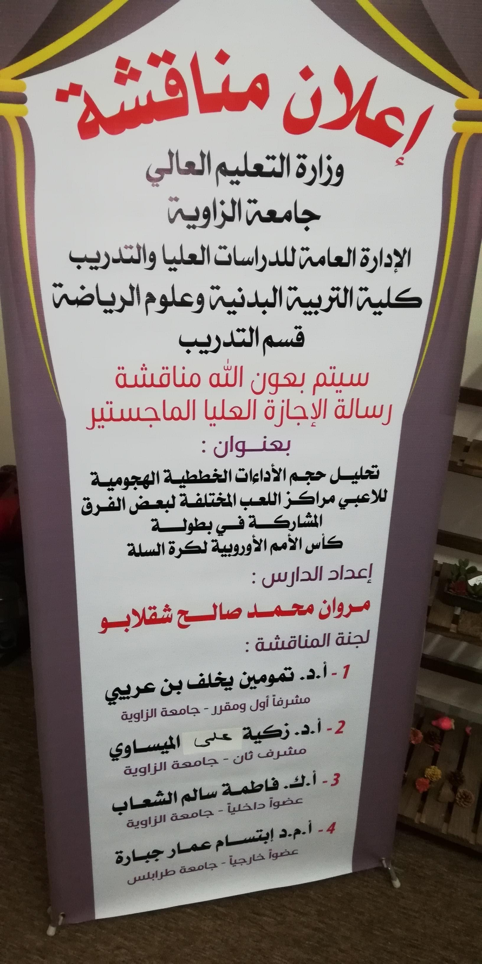 تم اليوم بكلية التربية البدنية وعلوم الرياضة مناقشة رسالة الماجستير للباحث مروان محمد شقلابو بعنوان // تحليل حجم الأداءات الهجومية للاعبي مراكز اللعب لبعض الفرق المشاركة ببطولة كأس الأمم الأوروبيةلكرةالسلة. وتكونت لجنة المناقشة والحُكم : من أ. د تمومين يخلف عريبي مشرف أول ومقرر أ. د زكية علي الميساوي مشرف ثان أ. ك. د فاطمة سالم الشعاب مناقشاً جامعة الزاوية أ. م. ك أبتسام عمار جبارة مناقشاً جامعة طرابلس، وأُجيزت الرسالة ومُنح الباحث درجة الماجستير في التربية البدنية وحضر المناقشة لفيف من أعضاء هيئة التدريس وطلاب الدراسات العليا بالكلية وبعض الضيوف.