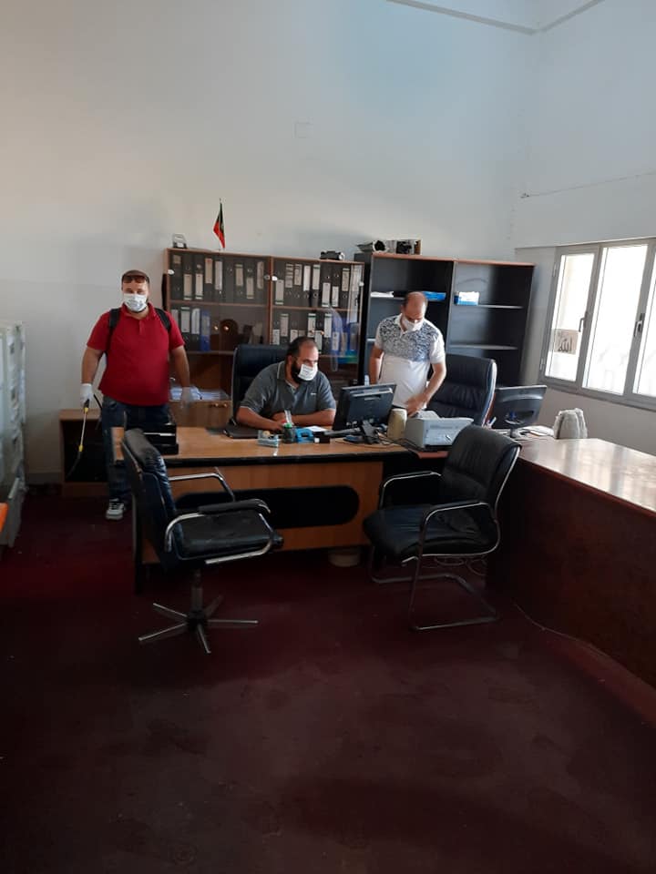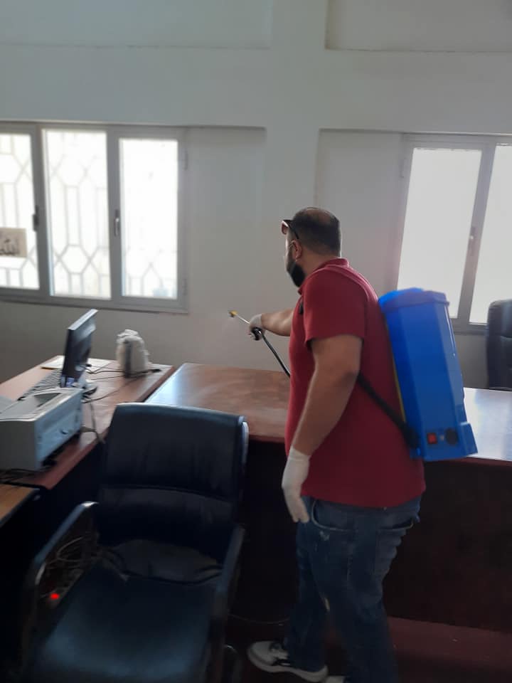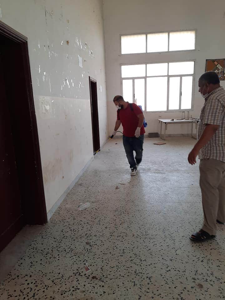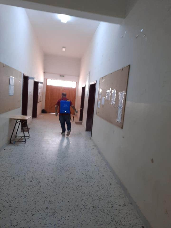 حرصا من ادارة الكلية لاستكمال الفصل الدراسي والمحافظة على صحة الطلبة والعاملين بالكلية قامت بالتواصل مع البلديات المجاورة لتوفير المستلزمات الوقائية لمكافحة جائحة فيروس كورونا نظرا لنقص توفرها بمخازن الجامعة . و بعد الحصول على كمية محدودة من مواد التعقيم والتطهير والقفازات والكمامات انطلقت يوم االسبت الموافق 18/07/2020 م الامتحانات العملية بالكلية. حيث تم توزيع الكمامات على الطلبة واعضاء هيئة التدريس و العاملين بالكلية . ولتعقيم مبنى الكلية قام العاملون بمكتب الشؤون الادارية والمالية بالكلية  برش المكاتب والممرات وقاعات الامتحانات بمواد التعقيم والتطهير.