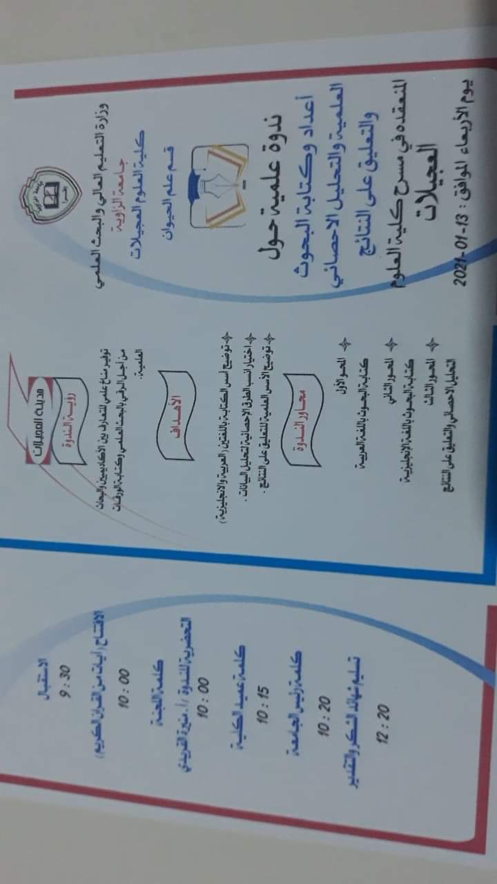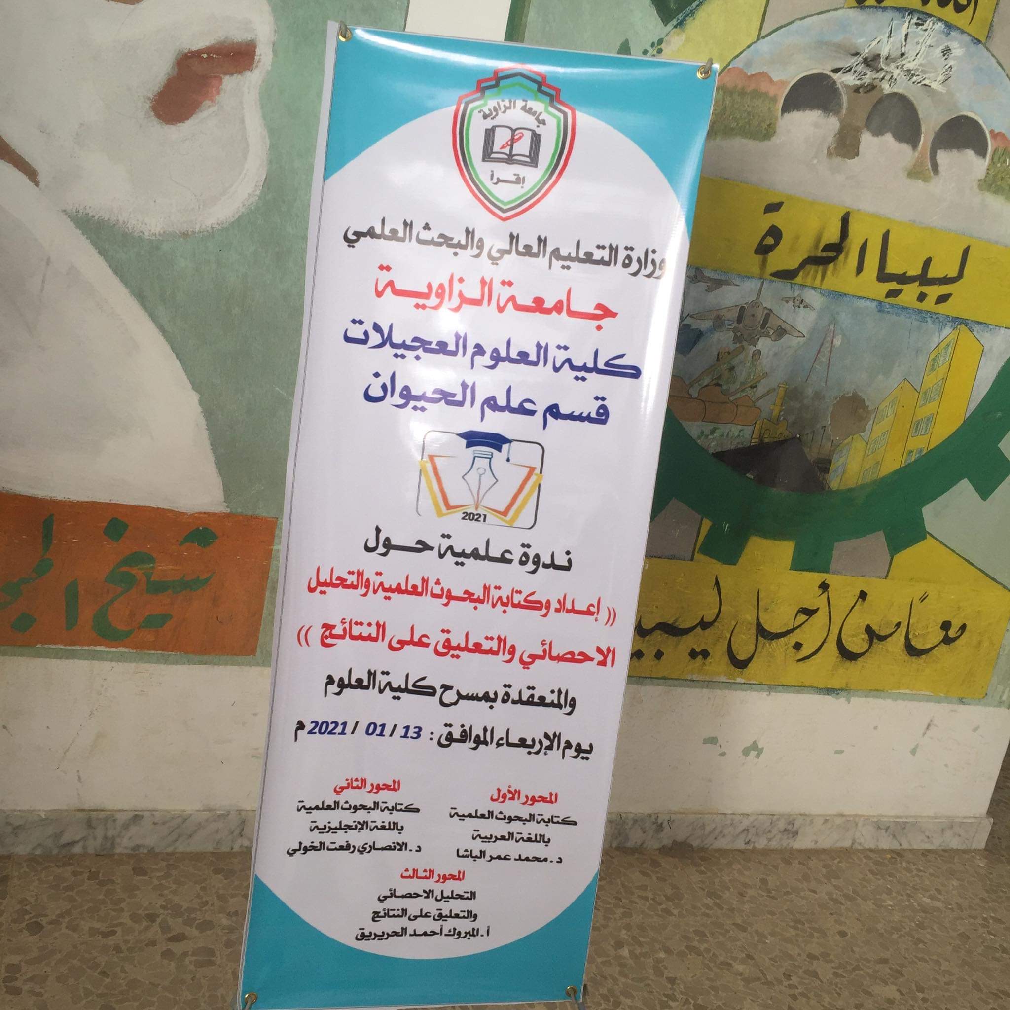 اقيمت يوم أمس الأربعاء الموافق 2021/01/13ندوة علمية حول اعداد و كتابة البحوث العلمية و التحليل الإحصائي و التعليق علي النتائج بمسرح كلية العلوم بالعجيلات . و بداء برنامج الندوة بتلاوة آيات من القرآن الكريم فكلمة اللجنة التحضيرية من قبل الأستاذة منيرة القريدي حيث رحبت بالضيوف الكرام واعطت نبذة مختصرة عن أهمية الندوة واهدافها ، و كلمة عميد الكلية حيث رحب بالحاضرين من أعضاء هيئة التدريس، و طلبة الدراسات العليا و المعيدين بالجامعات . و قسمت محاور الندوة الي ثلاثة محاور حيث قدم المحور الأول د. محمد الباشا حول إعداد و كتابة البحوث العلمية باللغة العربية ، و قدم المحور الثاني د. الأنصاري الخولي حول كتابة البحوث ( الورقات العلمية) باللغة الانجليزية، وقدم المحور الثالث الأستاذ المبروك الحريريق حول التحليل الإحصائي و التعليق علي نتائج البحث. ثم فتح باب المناقشة للحضور. و أختم برنامج الندوة العلمية بتوزيع شهادة الشكر و التقدير و التي أهمها شهادة الشكر و التقدير لرئيس المجلس التسييري لبلدية العجيلات، إذاعة العجيلات المحلية، المحاضرين، و أعضاء هيئة التدريس بالجامعات الاخري الحاضرين و اللجنة التحضيرية للندوة.و ختم البرنامج بجو يسود الرضا و الارتياح للحضور .
