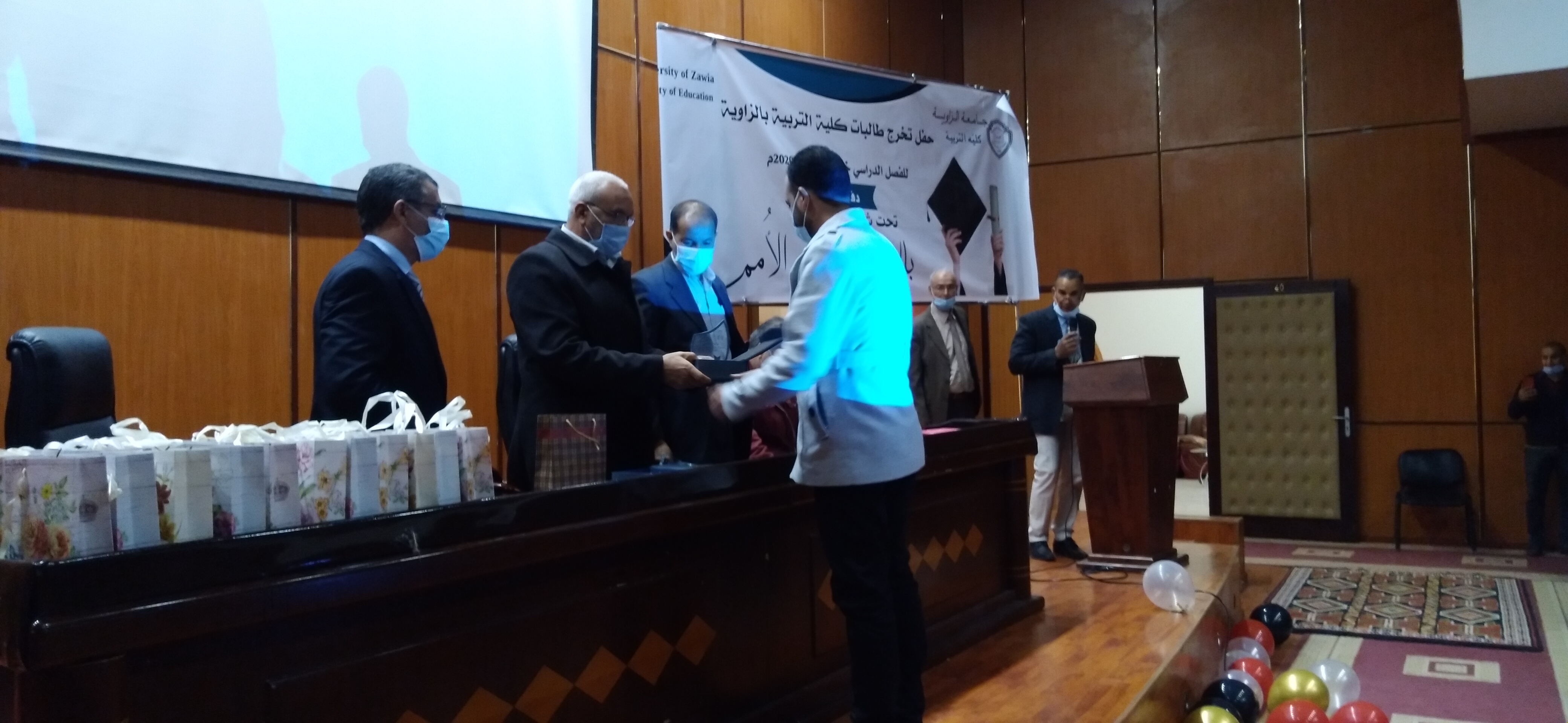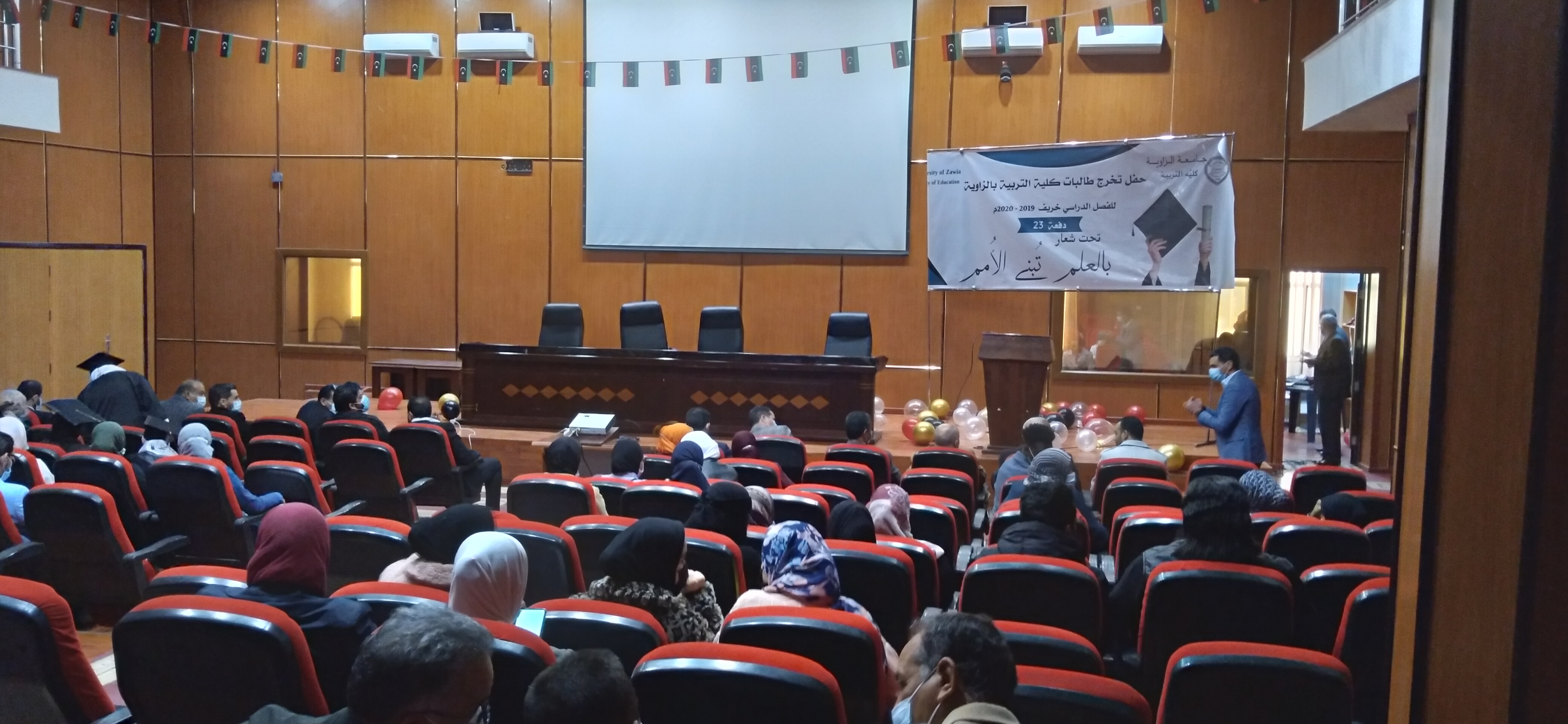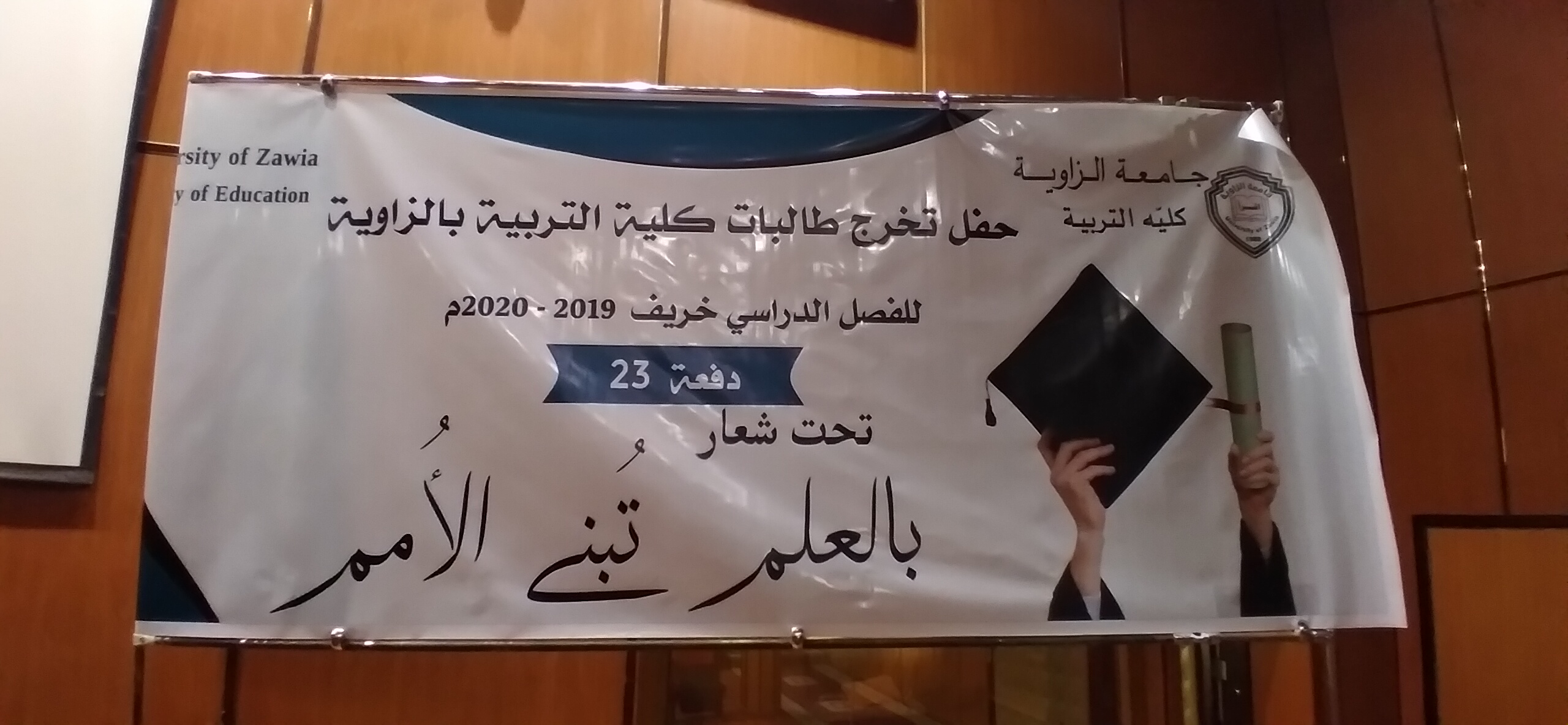أقيم صباح اليوم الاحد الموافق 2021/1/31 إحتفالية تخرج طالبات الدفعة (23) من كلية التربية الزاوية. وقد حضر الاحتفال السيد الكاتب العام بالجامعة و السيد المسجل العام بالجامعة و مراقب التعليم بالزاوية و عدد من الشخصيات التي تمثل مختلف المكاتب بالجامعة و البلدية.