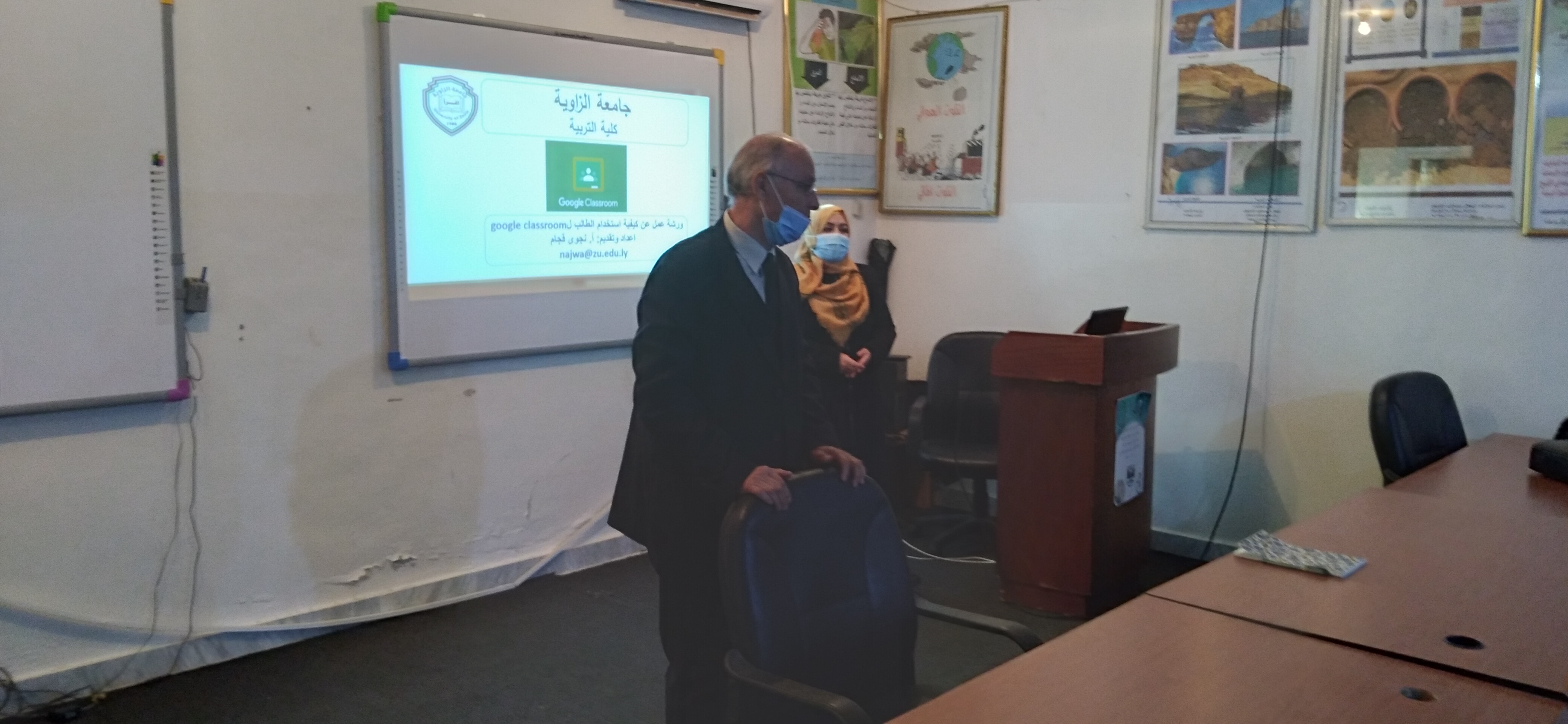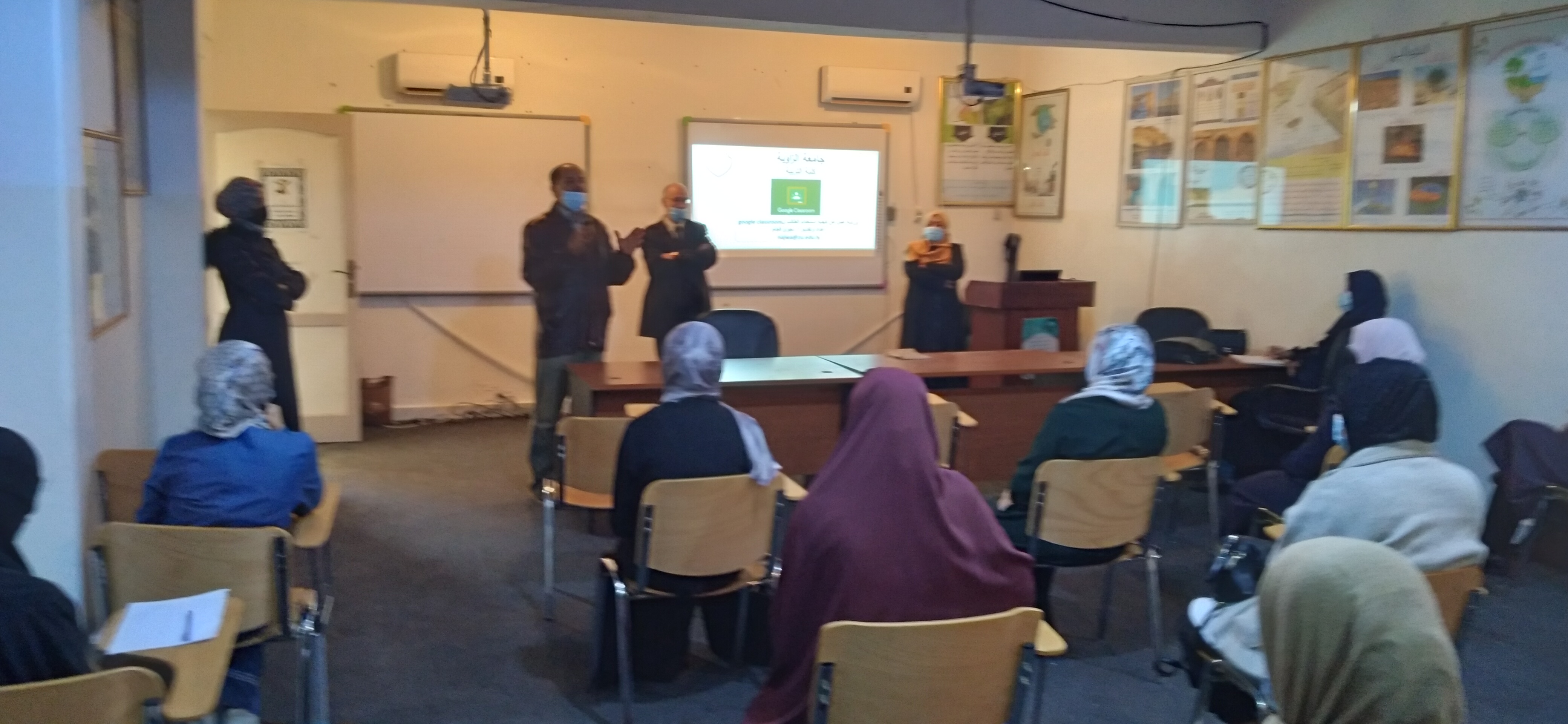 نظم قسم الفيزياء بكلية التربية الزاوية صباح اليوم الخميس الموافق 2021/2/11 ورشة عمل عن (تطبيق جوجل الفصل الافتراضي Google classroom وكيفية استخدامه والاستفادة منه في ادارة العملية التعليمية ) بقاعة التدريب بالكلية.