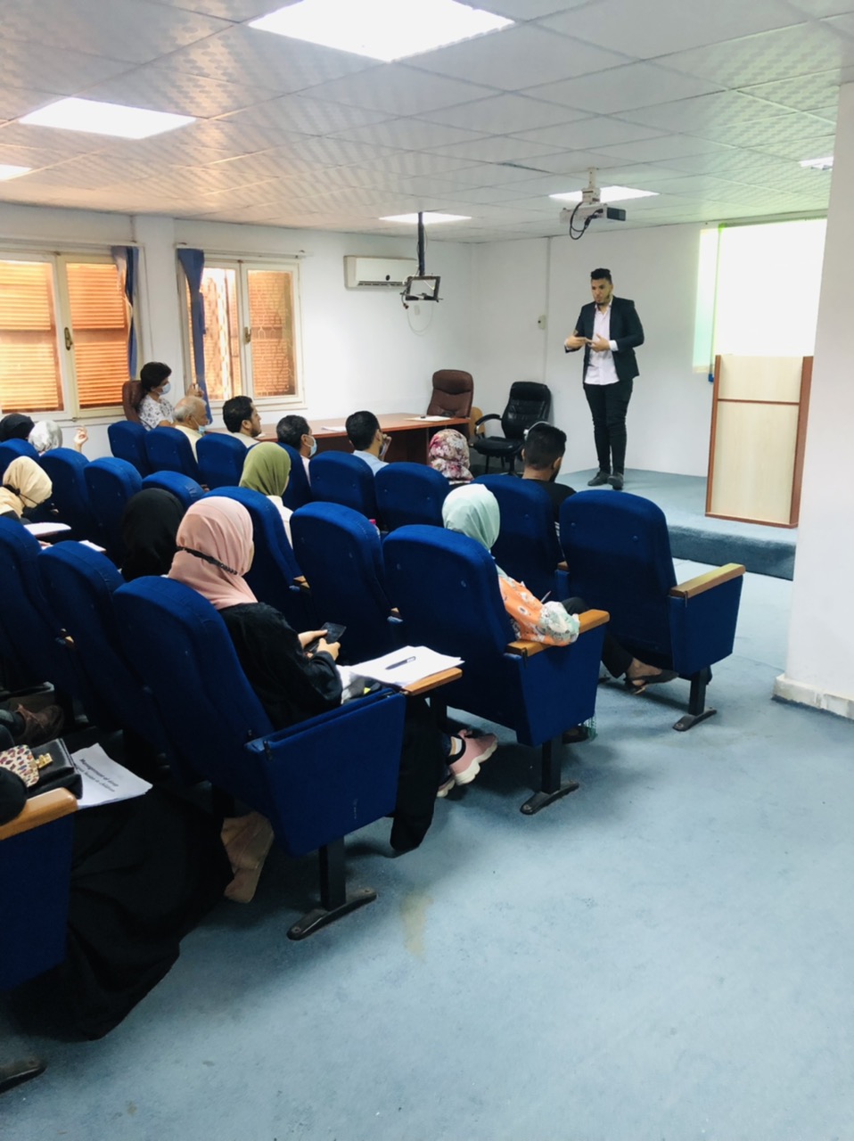 وذلك في حضور كلاً من عميد الكلية د. محمد رحومة وأعضاء هيئة التدريس د. صبحية شقلابو ، د. علي ميلاد ،د نجاة منصور ، د. إيهاب المقرحي وبحضور ضيوف من خارج الكلية أ. محمد مصطفى رئيس الإتحاد العام لطلبة جامعة الزاوية ود. إبراهيم التومي ود. حسن البرناوي مسجل كلية التربية الزاوية