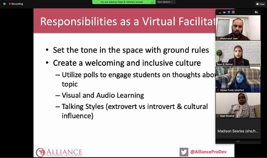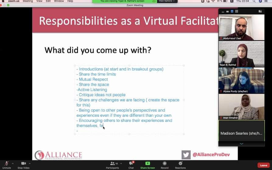 ستتوالى هذه المحاضرات التدريبية على فترات محدده ومجدولة يتم تقسيم المشاركين فيها الى مجموعات (على ان يكون في كل مجموعة مشاركين من جامعة الزاوية واخرين من الشارقة ونيويورك وبنغازي), يشترك اعضاء كل مجموعة في اعداد العروض والمحاضرات والمناقشات) وسيكون فيه تقييم وجوائز في نهاية البرنامج .