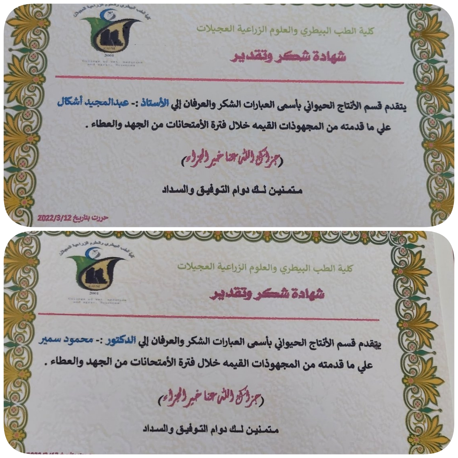 اقام قسم الإنتاج الحيواني برئاسة السيد رئيس القسم الدكتور عبدالحكيم العر وبمناسبة إختتام الإمتحانات النهائية لهذا الفصل ؛ حفل تكريم لأعضاء اللجنة العليا للإمتحانات بكلية الطب البيطري و العلوم الزراعية و ذلك لجهودهم التي بُذلت في سبيل سير عملية الإمتحانات في أحسن الظروف.